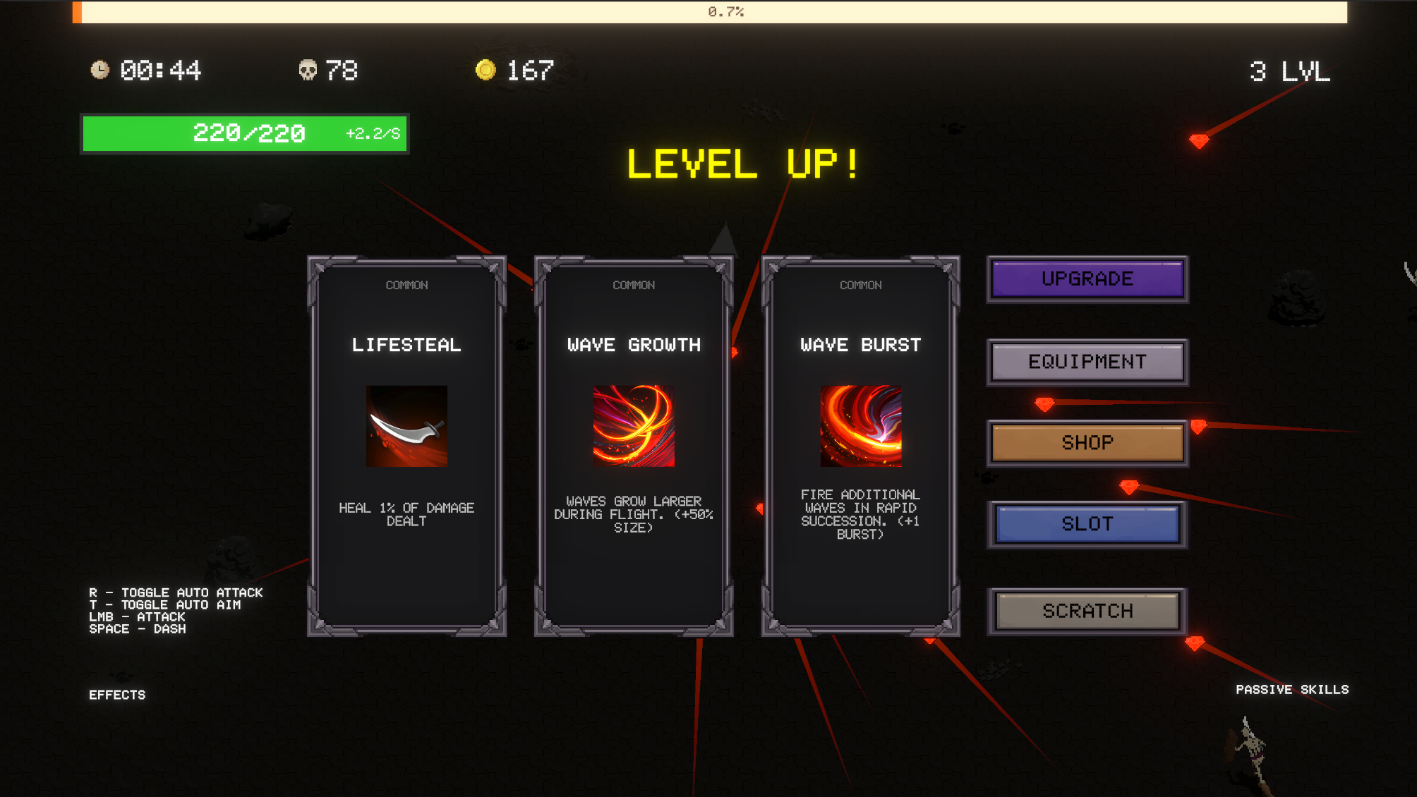 You are a blood mage. You don't just pick passive stats , you must fight your way to the anvil, which you can access from level up UI, place your weapon, scroll and trina (optionally) on it, and risk your gear to upgrade it.
